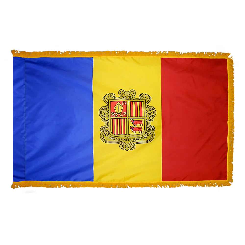 Indoor & Parade Flags: Available in sizes 3’x5' and 4’x6’. Manufactured with 100% Nylon and are lined with golden rayon fringe. The flannel lined pole hem will fit on flag poles up to 1 ¼” in diameter. Pole hem sewn tabs allow a secure attachment to the flagpole. Display a 3’x5’ flag on an 8’ pole and a 4’x6’ flag on a 9’ pole.