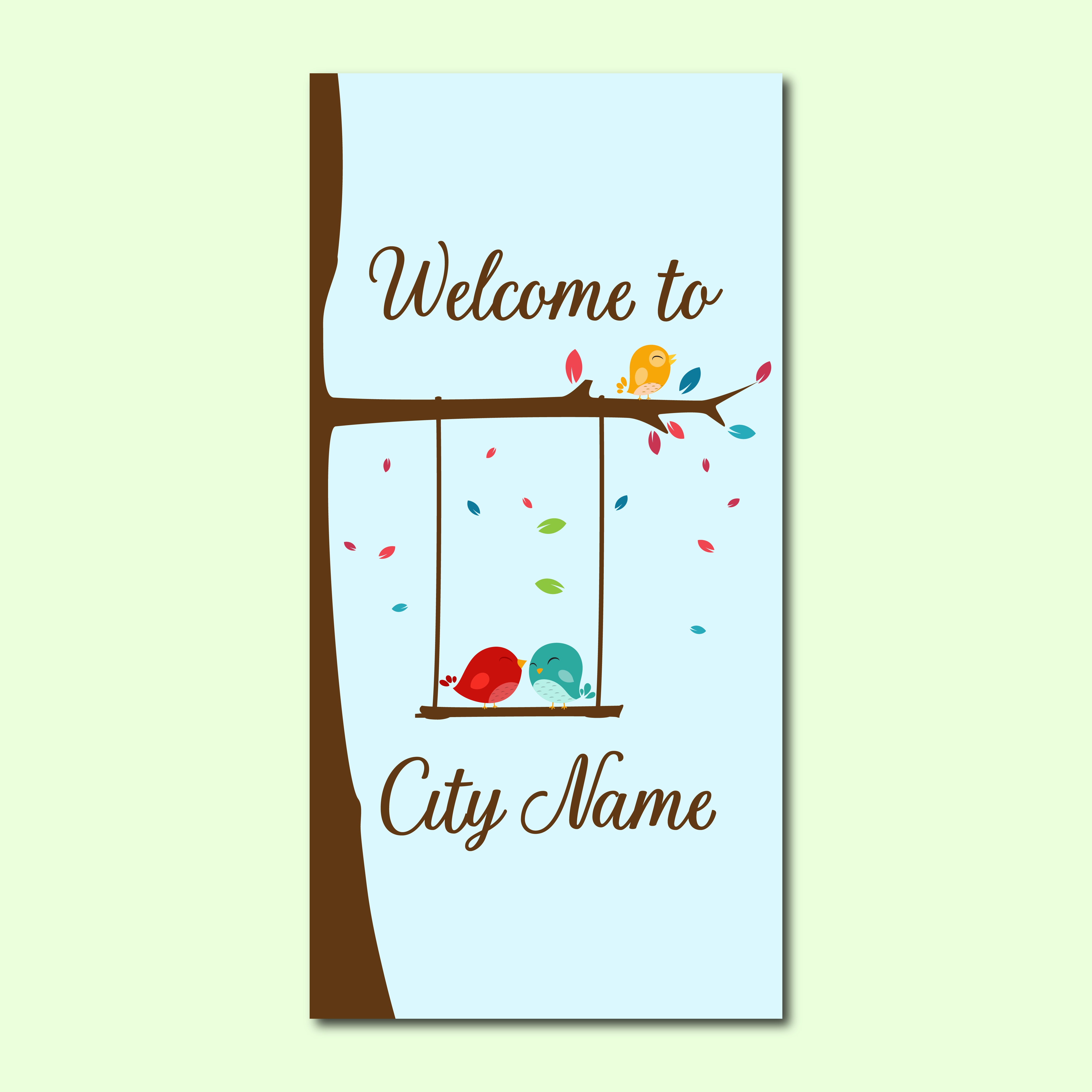 The design frames a customizable welcome message and city name, making it ideal for municipalities, campuses, parks, and community districts seeking a lighthearted and inviting seasonal streetscape. The soft color palette and friendly imagery make this banner especially appealing in pedestrian-friendly downtowns and family-oriented spaces.
