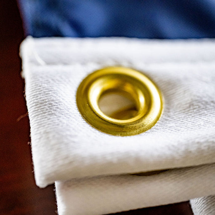 ***Flags 8’x12’ and larger feature appliqued white stars and a reinforced roped heading with galvanized thimbles or D Rings and extra grommets in the middle of the heading to better secure the flag to the flagpole.